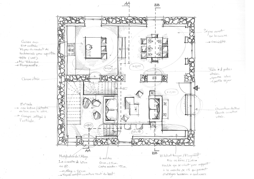 - Croquis et rendus 3D* : je vous présente des ébauches et des rendus numériques pour visualiser le projet.